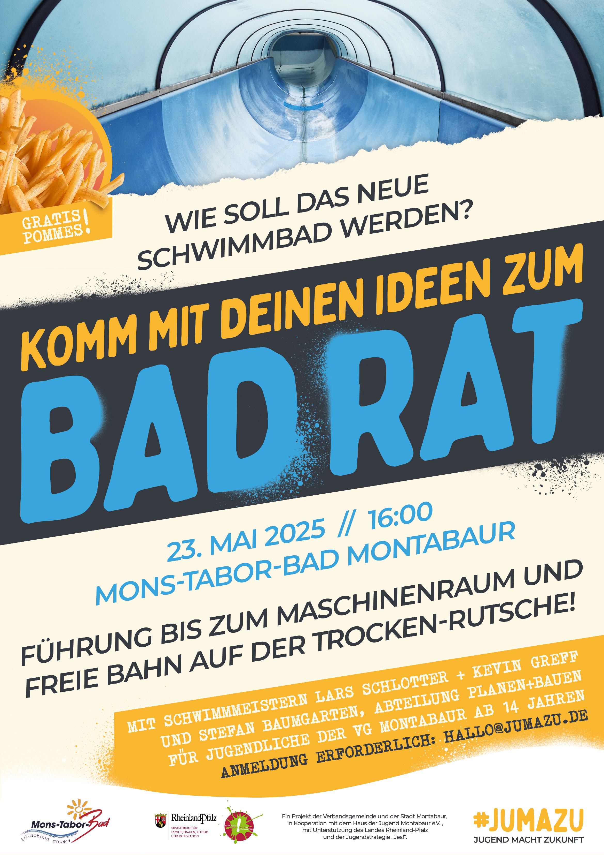 Komm zum BadRat und bring deine Ideen für das neue Schwimmbad mit. Führung im Maschinenraum, chillen in der Rutsch-Lounge und Schwimmbad-Pommes inklusive ;)