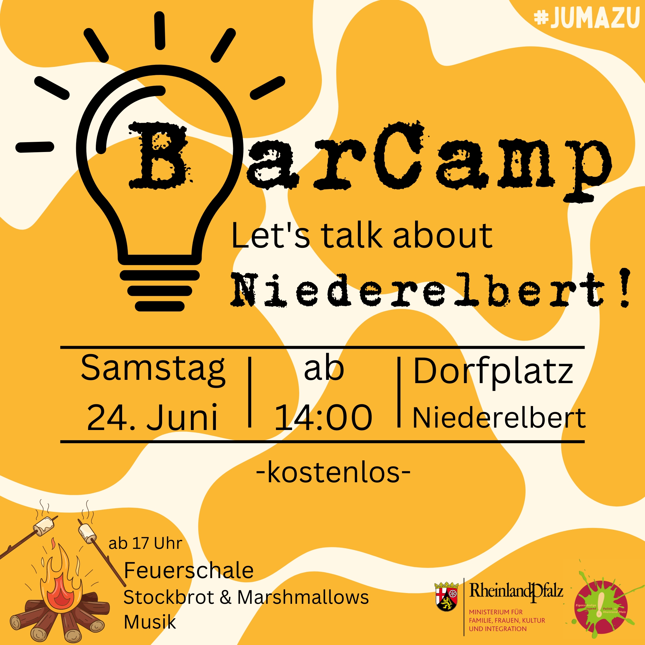 JumaZu kommt nach Niederelbert- sei DU dabei! Wir werden in entspannter Atmosphäre mit Gleichgesinnten über deine Ideen und Anregungen für euren Wohnort sprechen. Nach dem BarCamp gibt es ein Feuer in der Feuerschale und Stockbrot und Marshmallows als gemütlichen Ausklang.