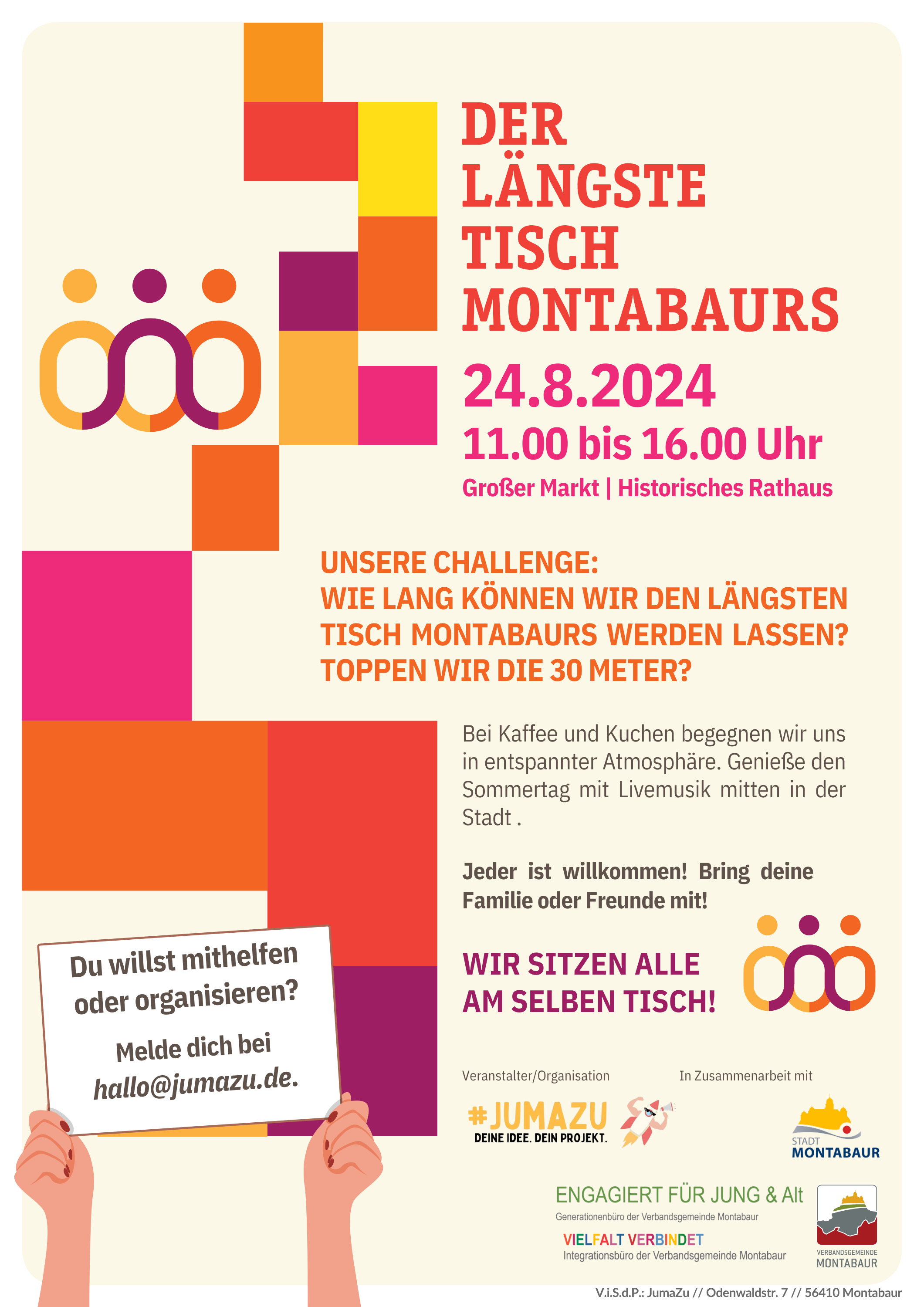 Setz dich an den längsten Tisch Montabaurs! Bei Kaffee, kalten Getränken, Kuchen und Livemusik verbringen wir gemeinsam einen schönen Spätsommertag mitten in der Stadt.