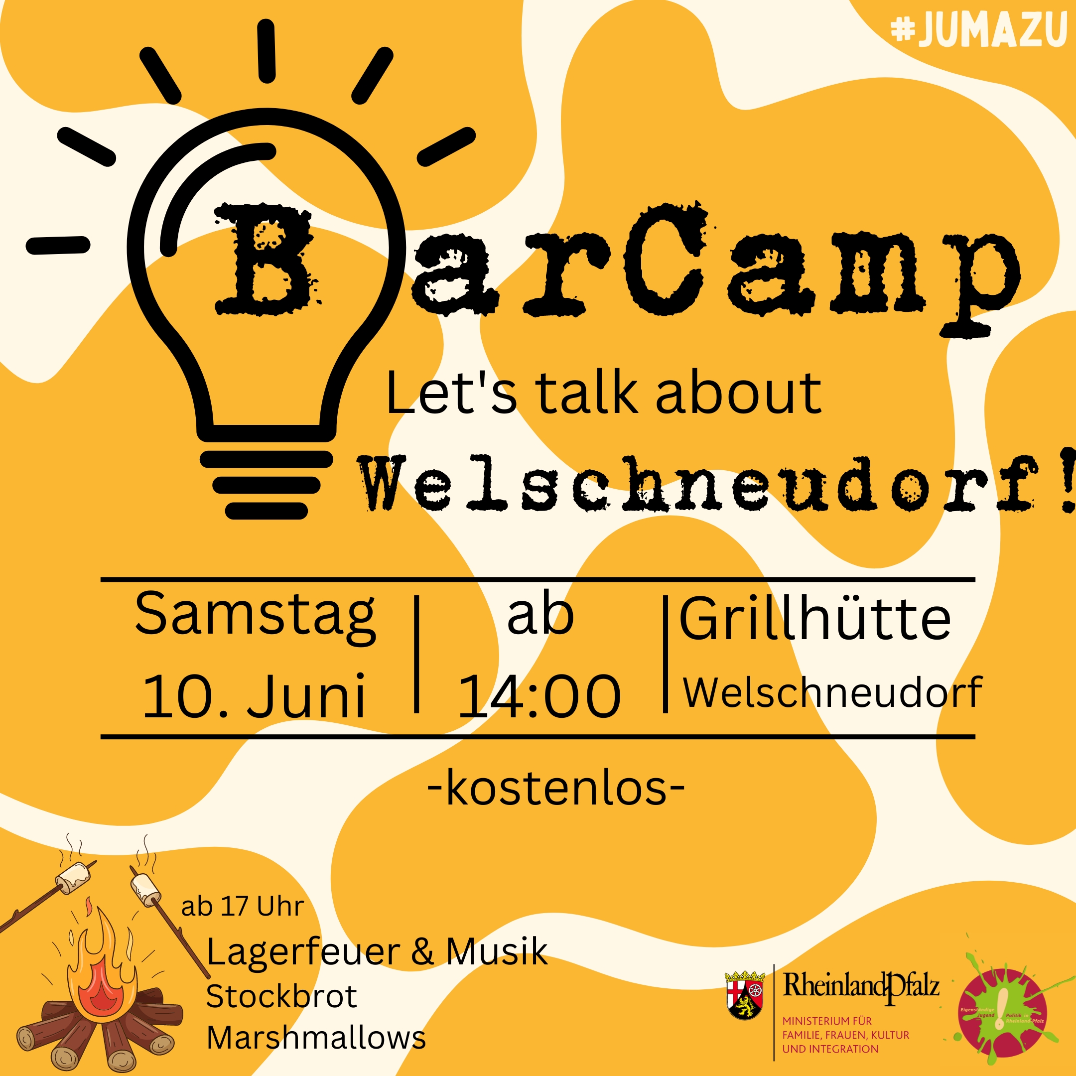JumaZu kommt nach Welschneudorf- sei DU dabei! Wir werden in entspannter Atmosphäre mit Gleichgesinnten über deine Ideen und Anregungen für euren Wohnort sprechen. Nach dem BarCamp gibt es Lagerfeuermusik als gemütlichen Ausklang.