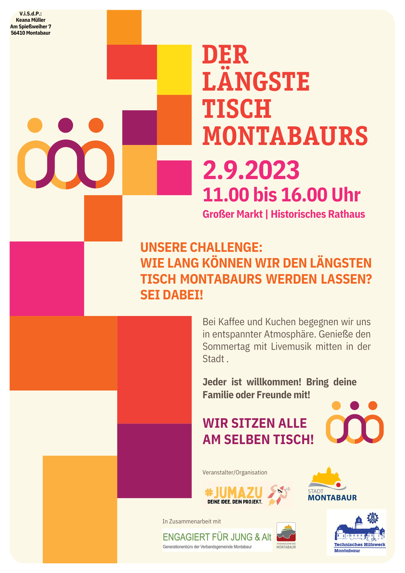 Setz dich an den längsten Tisch Montabaurs! Bei Kaffee, kalten Getränken, Kuchen und Livemusik verbringen wir gemeinsam einen schönen Spätsommertag mitten in der Stadt.
